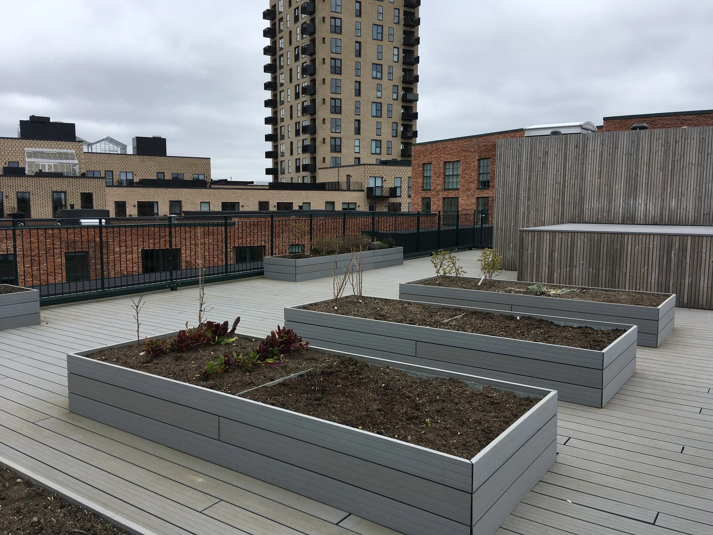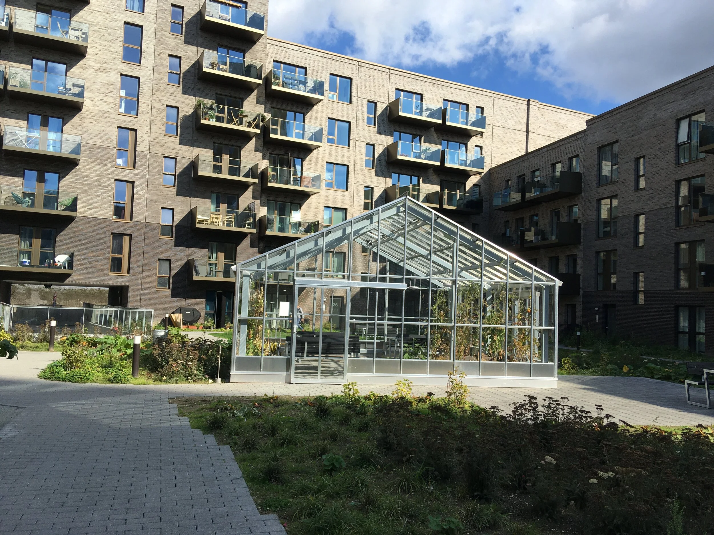 The old wholesale market, Grønttorvet, in Valby, which has been a trading place for fruit, vegetables, and flower merchants since 1958, has transformed into a modern neighborhood with budding greenhouses on top of the roofs and lush courtyard gardens. The impressive transformation has been carried out by the FB group. Here, you'll find a mix of family homes, senior residences, student accommodations, cooperative housing, and co-living communities. Life flourishes uniquely on the rooftops and in the beautiful Grønttorvet Park by Plads 23, designed by the architects Lendager Group, who tie the district together. What does it look like, and what are the characteristics of the new neighborhood? We'll walk through Grønttorvet Park, past Lathyrus House, see the Amaryllis and Verbena towers, Belle de Boskopvej, and Paradisæblevej, among other places